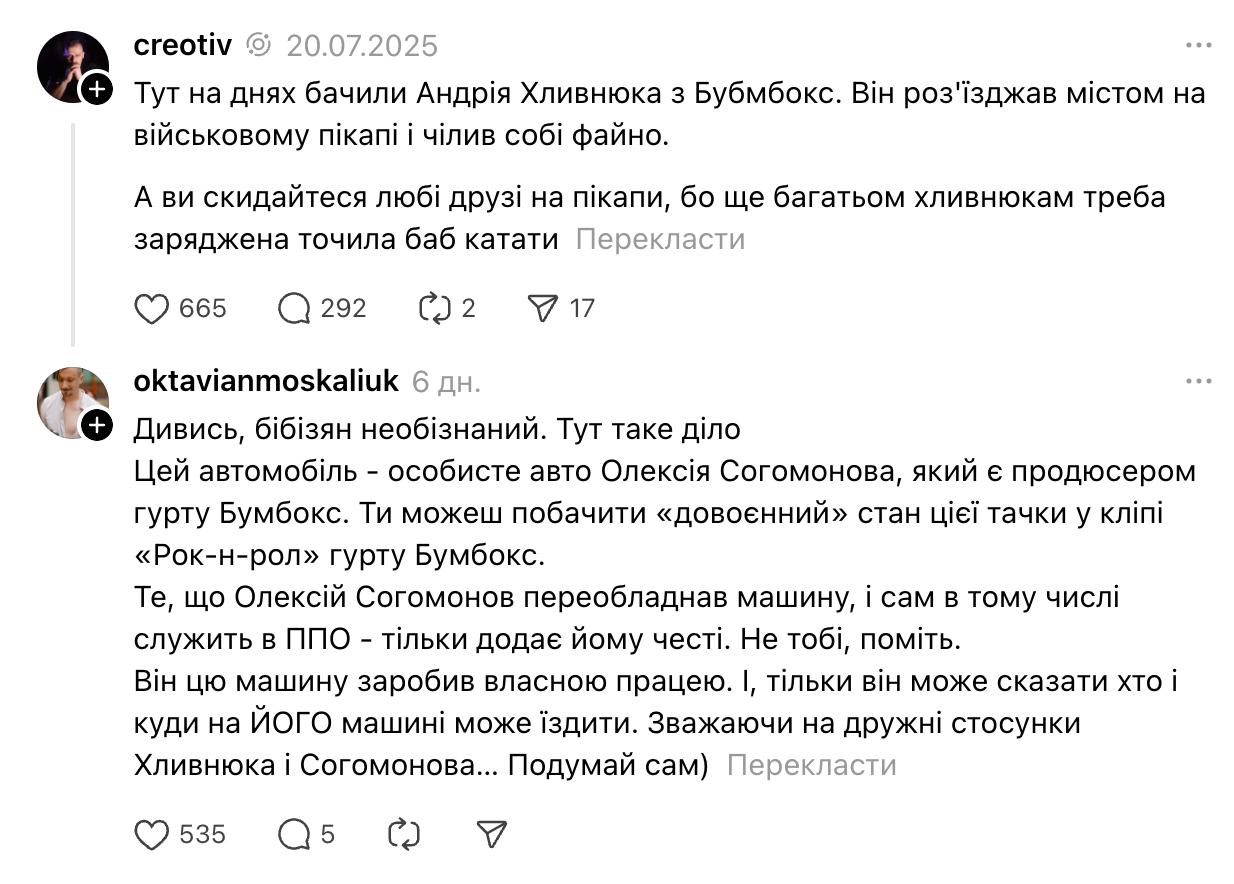 В постах у соцмережі Threads з’явилися критичні коментарі: “Тут на днях бачили Андрія Хливнюка з “Бумбокс”. Він роз’їжджав по місту на військовому пікапі і файно чилів. А ви скидайтеся, дорогі друзі, на пікапи, бо ще багатьом Хливнюкам потрібна заряджена тачка баб катати”.