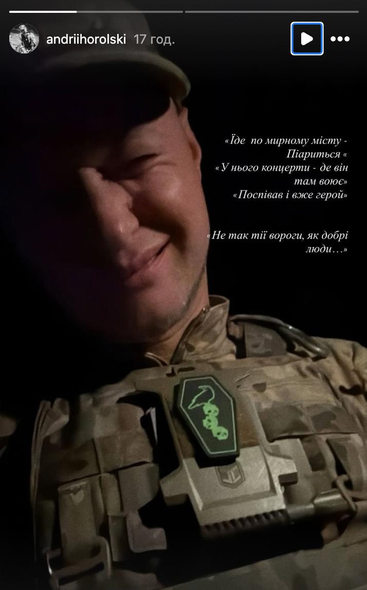 Андрій Хливнюк не залишився осторонь і відповів на критику в своїх Stories в Instagram. На фотографії в військовій формі він процитував основні звинувачення на свою адресу: “Їде по мирному місту”, “Піариться”, “У нього концерти – де він там воює”, “Поплів та вже герой”.